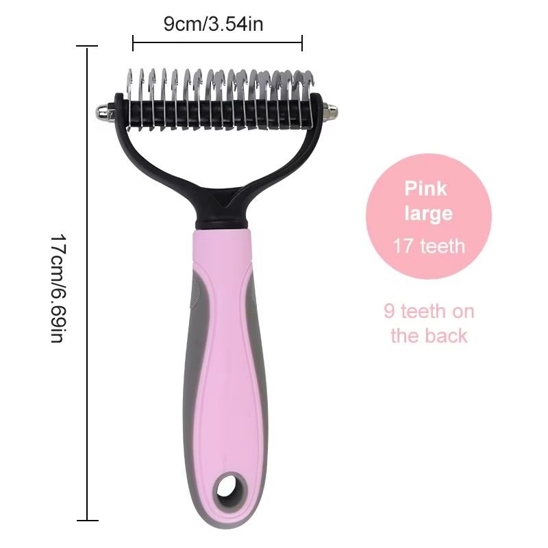 1.Revamped Dual-Sided Design: Unleash the power of our innovative brush, starting with the 9-tooth side to tackle the most stubborn mats and tangles with ease. Then, switch to the 17-tooth side for a finishing touch that thins and de-sheds, delivering salon-quality grooming in the comfort of your home.