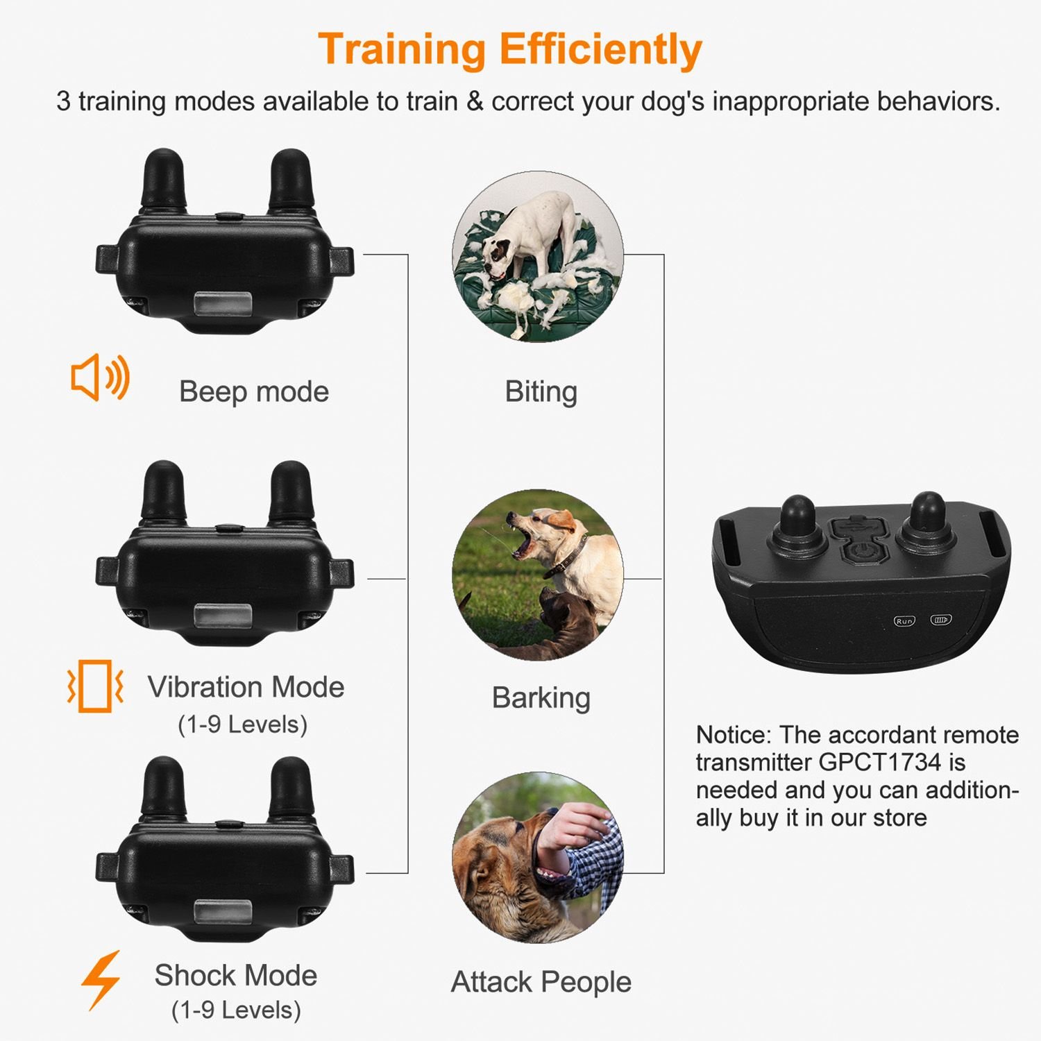 *Longest Receiving Range*: Up to 1640FT receiving range, this dog training collar helps you to freely train your dog at backyard, park, beach, and seaside. Effectively stop your dog from barking even you are in another room by working together with dog training remote transmitter (Note: dog training remote transmitter is not included. The accordant remote transmitter GPCT1734 is needed and you can additionally buy it in our store.).