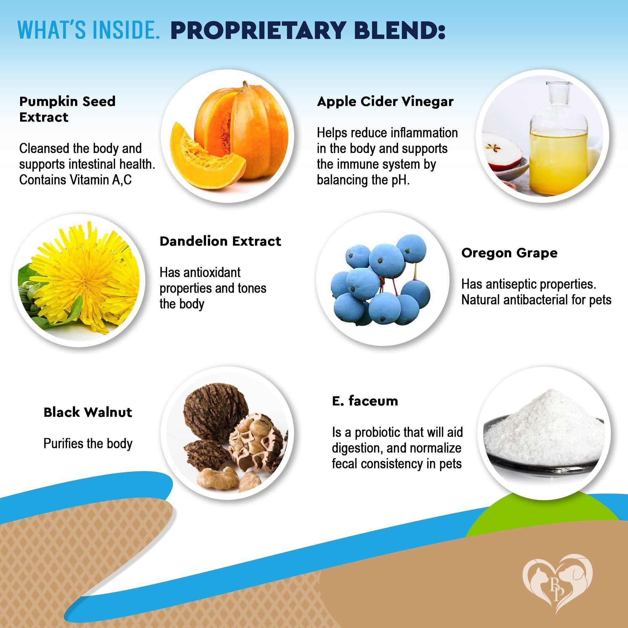 2.advanced digestion support : if your pet has regular stomach issues like gas, diareaha, sensitive or upset stomach, constipation, gas, acid, loose stool, bad breath or other, daily probiotic treatments, fiber and enzymes will help ease this issue and maintain healthy digestion.